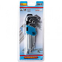 Set of 9 double ended TORX L-keys with hole, sizes T10 to T50.