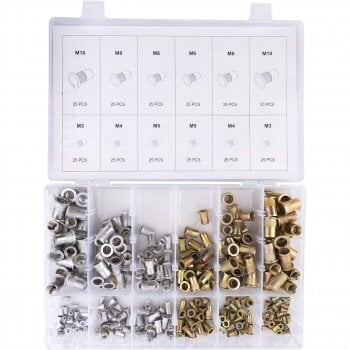 Rivet nuts make it possible to screw a screw with a metric thread into a sheet or other materials, where it is not possible to make a thread. Includes Steel: M3- 25 PCS, M4-25 PCS, M5- 25 PCS, M6- 25 PCS, M8-25 PCS, M10-25 PCS Aluminum: M3- 25 PCS, M4-25 PCS, M5- 25 PCS, M6- 25 PCS, M8-25 PCS, M10-25 pcs