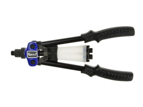 Professional riveting machine designed for making connections of various types of materials with the use of blind rivets. The riveter is made of the highest quality materials. Equipped with a set of five tips in sizes: 2.4 mm; 3.2mm; 4.0mm; 4.8mm; 6.4mm. Handles are finished with comfortable, profiled rubber grips for maximum comfort of work.