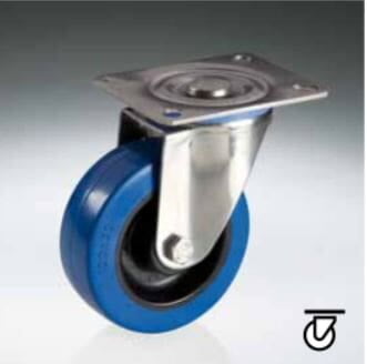 Stainless steel swivel housing, plate fitting, with double ball race.Wheels with stainless steel roller bearing, Blue non -marking elastic rubber tyres,Polyamide 6 wheel centre, 125 mm wheel diameter, total height 160 mm, maximum weight 200kg