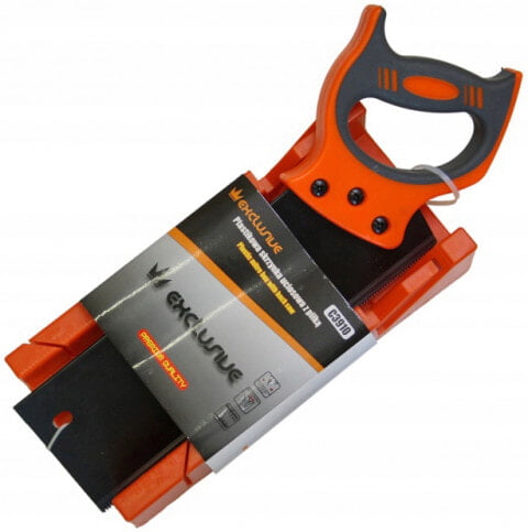 High-quality ABS miter box with a saw with universal toothing, with angles of 45o, 60o and 90o, a limiter to rest against the table edge, holes for mounting on a workbench.