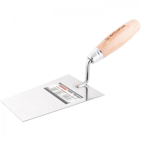 Professional stainless steel trapezoidal trowel with a wooden handle.Intended for stone and bricklaying works.