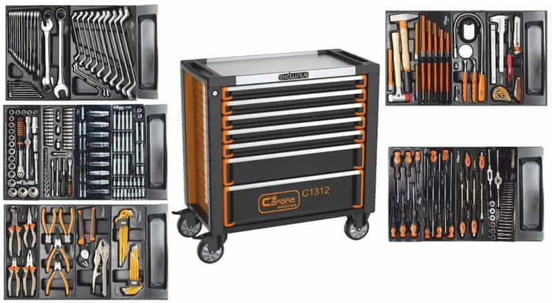 Product description: Workshop trolley with accessories. The universal perforation makes it possible to retrofit the cabinet with additional elements. Technical data: - Trolley width: 900 mm - Trolley height: 930 mm - Trolley depth: 465 mm - Wheel height: 125 mm - Drawers: 7 on ball bearing slides - Central locking: yes - Separate closure for each drawer: yes - Corners, bumpers: rubber - Wheels with brakes: yes - Set: 268 pieces The set includes: - C1200: combination wrenches 6 - 32 mm, 24 elements - C1202: combination wrenches 6 - 32 mm, 12 pieces - C1299: empty insert for small accessories - C1205: 1/2 "socket set, 8 - 32 mm, 25 pieces - C1206: 1/4 "socket set, 4 - 14 mm, bits S2 steel, 44 elements - C1224: long sockets 4 - 24 mm, 1/4 ", 1/2" - C1235: bit set, 40 pieces - C1213: pliers, 4 pieces - C1214: 180 mm Seger pliers, 4 pieces - C1215: 250 mm pliers, 250 mm pipe pliers - C1209: 1.5 mm hexagon keys + Torx T10-T50, 18 elements - C1299: empty insert for small accessories - C1221: sheet metal accessories, 5 elements - C1234: chisels and punches, 10 pieces - C1216: magnetic accessories + lamp, 6 pcs - C1217: accessories for measuring, marking and cutting, 7 pieces - C1299: accessory insert empty - C1232: 6 piece screwdrivers - C1233: long screwdrivers, 5 pieces - C1225: Impact screwdrivers, 4 pieces - C1237: M3 - M 12 tap and die set with handwheel, 32 pieces - C1299: empty insert for small accessories - C1312: workshop trolley