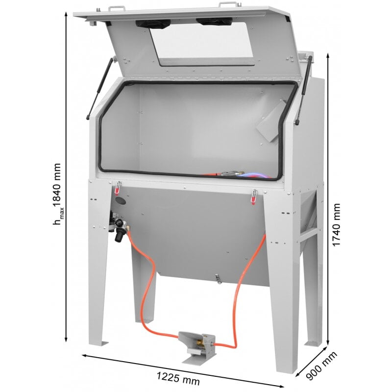The sandblasting cabinet with front opening is a significant convenience for large and heavy workpieces. Telescopic cylinders mounted in the door help with opening. As a standard, the sandblaster has a built-in dust extractor during sandblasting objects. Equipped with a set of nozzles, gun and visor protection stickers. Device description We offer you a brand new device, a sandblasting cabinet with 420 liters capacity. The sandblaster is fully complete, equipped with a proven control system, a solid and large cabin with front-opening doors, sandblasting gun, eight ceramic nozzles, high-quality work gloves, workspace lighting, large window - viewfinder (no blind spot) dust collector and cyclone filter. This recommended device provides, in addition to its compact design and large and spacious working space, ease of use, reliability and work safety. Dust-free operation of the device is ensured by the use of peripheral seals, which allows the work to be carried out in an environmentally friendly manner. The sandblasting hose is placed in the lower part of the collecting container. The drain hole allows for a quick change of sandblasting material. The sandblaster is used for cleaning and treating various surface types, e.g. removing rust, paint, deposits from metal surfaces, e.g. automotive parts, engines, fittings, housings, wheels, rims, etc. As abrasive, can be used among others: quartz , silicon, glass beads, plastic sand, emery and other materials. Manometer with built-in pressure regulator, manually set. A limit switch mounted in the cabin, coupled directly with the pressure regulator, cutting off the compressed air supply after opening the cabin Strong telescopic cylinders helping with opening front doors. Technical parameters AIR DEMAND 400-700 L / min AVERAGE AIR DEMAND 270 L / min, 6 BAR WORKING PRESSURE 2.75 - 5.5 BAR PERMISSIBLE PRESSURE 8 BAR AIR CONNECTION quick release 1/4 " VIEWFINDER AREA 570 x 265 mm VACUUM CONNECTION (VENT) fi 64 mm and 90 mm DIMENSIONS 1225 x 900 x 1740 mm DIMENSIONS INSIDE THE CAB 1160 x 580 x 580 mm CHARGE DIMENSIONS 1020 x 560 mm WEIGHT 125 kg Standard equipment Cyclone extractor Working area lightening - a 12 V fluorescent lamp with a 230 V power supply with a switch 8 pcs of ceramic nozzles 2 high-quality work gloves made of rubber, integrated into the device 2 suction (venting) connections with a diameter of 64 mm and 90 mm for the connection of an mounted extractor Sandblasting gun with eight interchangeable ceramic nozzles 4 pcs of removable protective film for the window, viewfinder 4 pcs of removable protective film for work lights Front door with rubber perimeter seals for dust-free operation Manual in English