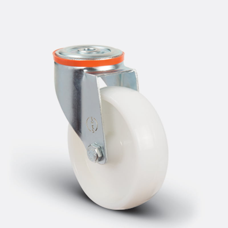 Heavy Duty Polyamide wheel [natural white],- Polyamide wheel.- Hub with roller bearing.Maximum Load Capacity 160kg Wheel Diameter 125mm Dimension from mounting top to floor 157 mm