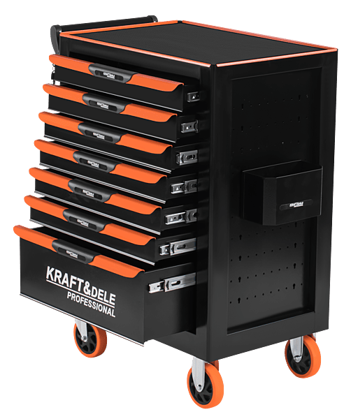 The KRAFT&DELE KD1079 professional workshop cabinet is a sturdy and functional tool storage solution. Equipped with seven spacious drawers with foam lining, it keeps accessories organized and safe. With a steel top resistant to damage and chemicals and locking casters, this cabinet is a perfect addition to any workshop.