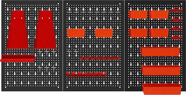 The metal construction ensures durability and stability, while the perforated surface allows for easy installation of hangers, hooks, and containers. The accessory set allows for practical organization of hand tools, mounting hardware, and small accessories, increasing work comfort and maintaining order in the workspace.