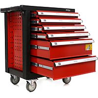 The steel construction, ball-bearing slides, and lockable drawers ensure durability, safety, and ease of use. Large wheels, including two swivel casters, make it easy to move the cabinet even over uneven surfaces. The tools are made of chrome-vanadium (CrV) steel, ensuring high resistance to damage and long service life.