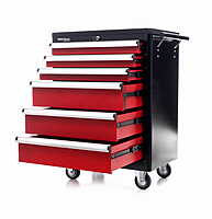 The cabinet features three smaller drawers for small tools and three spacious lower drawers for larger workshop tools .