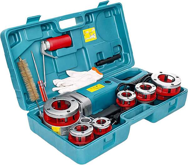 The threader is equipped with double insulation and a dedicated drive system for increased safety. The aluminum alloy gear housing requires no additional lubrication, and the fiberglass-reinforced handle ensures a secure grip and durability. The kit includes a complete set of threading heads and additional accessories to facilitate work.