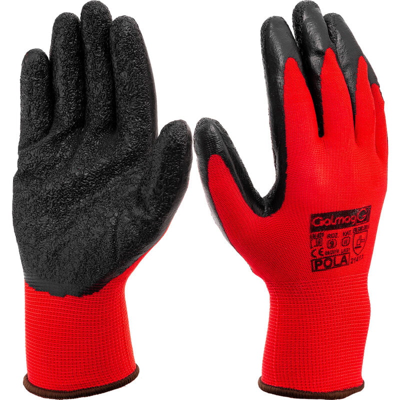 Description: Set of 12 pairs of NYLON-LATEX protective gloves. Gloves meet the EN 388 and EN 420 standards. Made of polyester coated with latex (category II). Finished with an elastic welt. They meet the requirements of the protection category CE KAT. II. They provide protection against abrasion, cuts, tears and punctures (on a scale of 2, 1, 4, 1, X). They provide a wide range of applications, including: warehouse work, construction, transport, reloading. They meet all European standards (CE). SPECIFICATION: Type: Work gloves Color: black / red Material: polyester / latex Standards: EN 388 / EN 420