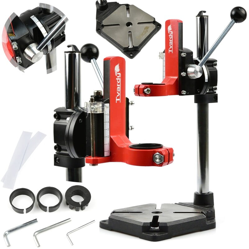 High-quality drill stand with vertical head adjustment. Designed for precise drilling at an angle of 0° - 90° in various materials. The ability to drill at an angle is especially useful in carpentry when making hidden joints. The solid, rigid structure ensures extremely high drilling precision. The three adapters included in the set will allow you to mount virtually any drill on the stand.