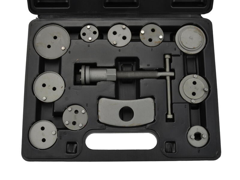 Professional 12-piece brake piston retraction/extrusion kit, essential when repairing vehicles equipped with disc brakes.