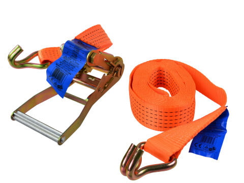 Product DescriptionTie down straps are fasteners used to hold down cargo or equipment during transport.Product FeaturesHigh quality Polyester webbing with J hooksRatcheting buckle offers a secure attachmentWorking load 5000 kgComplies with EN12195-2:2000Technical DataStrap Length: 6 mWebbing Width: 50 mmBreak Strength: 5000 kgFastener Style: RatchetHook(s): YesMaterial: 100% Polyester